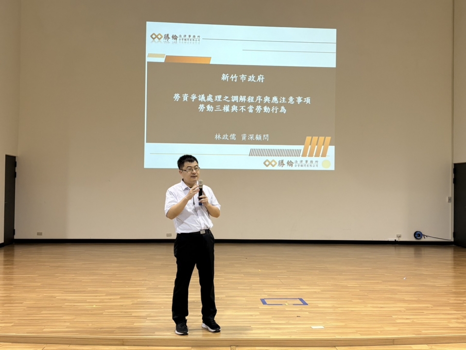 活動當日由新竹市政府勞工及青年處勞資關係科 葉科長璐嘉親臨指導,勝綸法律事務所林政儒講師以豐富的實務經驗,深入解析勞動三法重點與案例,讓與會學員收穫滿滿,對於勞資爭議預防與協商技巧有更進一步的認識。