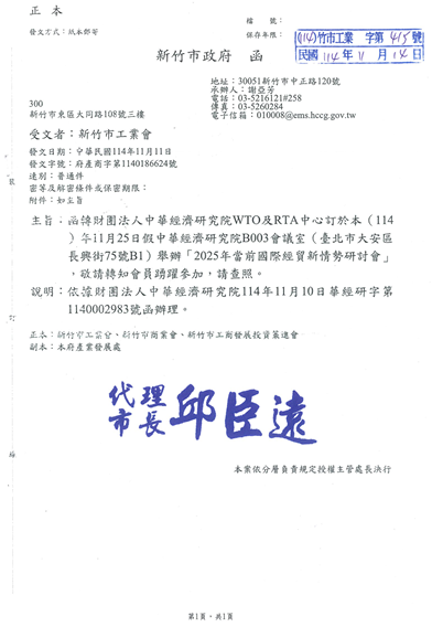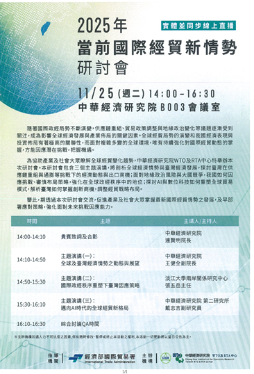函轉財團法人中華經濟研究院WTO及RTA中心訂於本(114)年11月25日假中華經濟研究院B003會議室(臺北市大安區長興街75號B1)舉辦「2025年當前國際經貿新情勢研討會」,敬請轉知會員踴躍參加,請查照。 2025.11.17