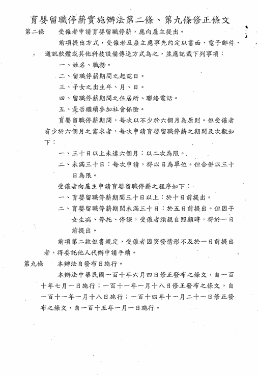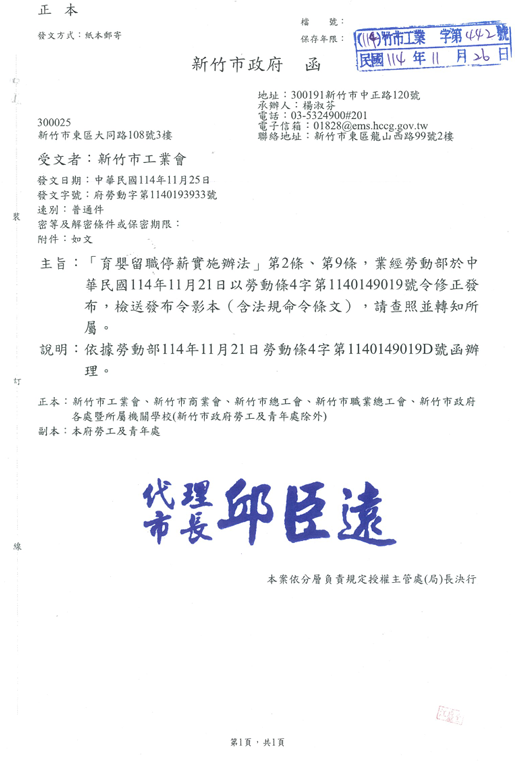 「育嬰留職停薪實施辦法」第2條、第9條,業經勞動部於中華民國114年11月21日以勞動條4字第1140149019號令修正發布,檢送發布令影本(含法規命令條文),請查照並轉知所屬。 2025.12.03