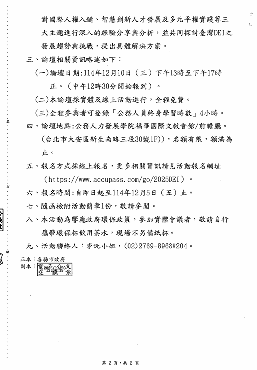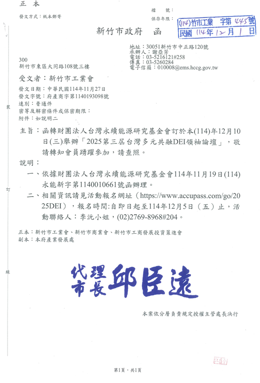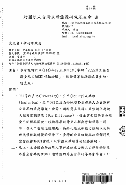函轉財團法人台灣永續能源研究基金會訂於本(114)年12月10日(三)舉辦「2025第三屆台灣多元共融DEI領袖論壇」,敬請轉知會員踴躍參加,請查照。