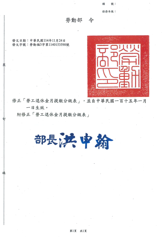 「勞工退休金月提繳分級表」,業經勞動部於中華民國114年11月24日以勞動福3字第1140153598D號令修正發布,檢送發布令影本(含分級表)1份,請查照並轉知所屬。