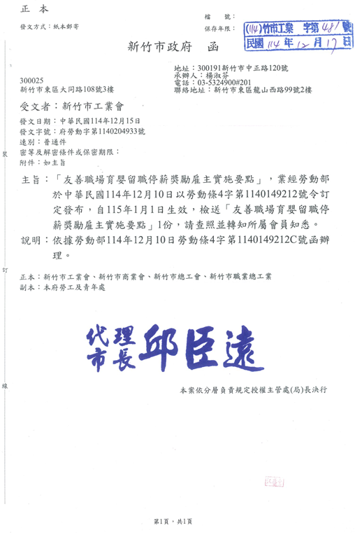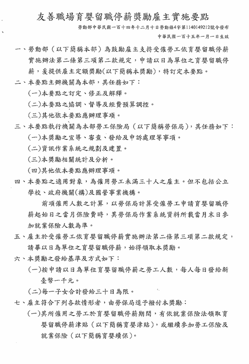 「友善職場育嬰留職停薪獎勵雇主實施要點」,業經勞動部於中華民國114年12月10日以勞動條4字第1140149212號令訂定發布,自115年1月1日生效,檢送「友善職場育嬰留職停薪獎勵雇主實施要點」1份,請查照並轉知所屬會員知悉。 2025.12.22