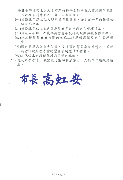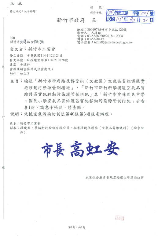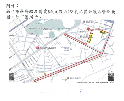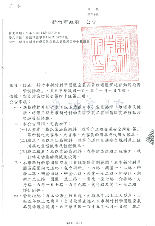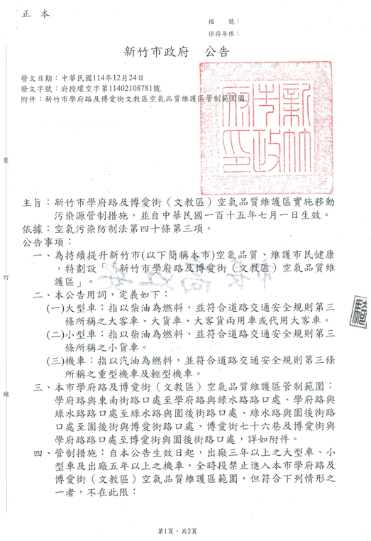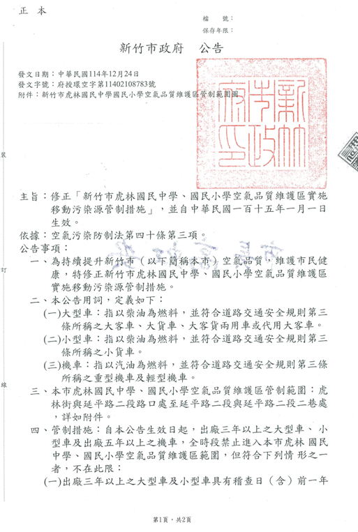 檢送「新竹市學府路及博愛街(文教區)空氣品質維護區實施移動污染源管制措施」、「新竹市新竹科學園區空氣品質維護區實施移動污染源管制措施」及「新竹市虎林國民中學、國民小學空氣品質維護區實施移動污染源管制措施」公告各1份,請惠予張貼,請查照。 2026.01.02