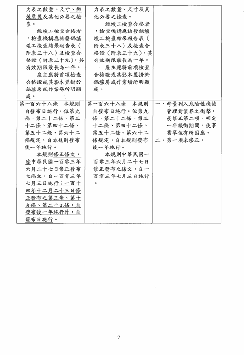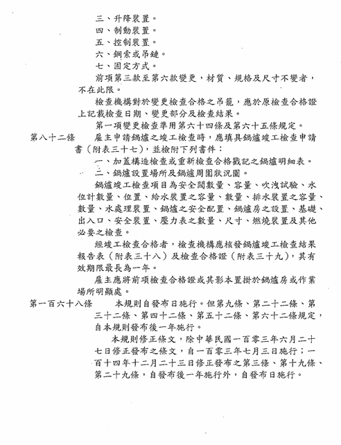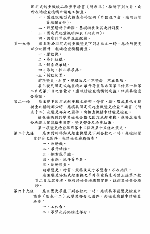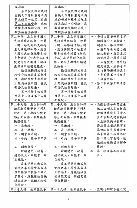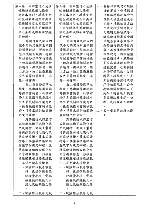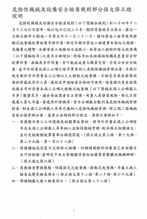 函轉勞動部於中華民國114年12月23日以勞職授字第1140255230號令修正發布「危險性機械及設備安全檢查規則」部分條文,檢送修正條文、總說明及條文對照表各1份,請查照並轉知所屬會員。 2026.01.05 危險性機械及設備安全檢查規則修正草案