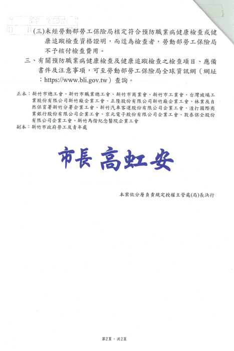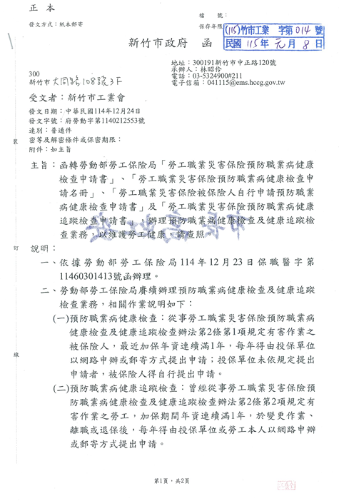 函轉勞動部勞工保險局「勞工職業災害保險預防職業病健康檢查申請書」、「勞工職業災害保險預防職業病健康檢查申請名冊」、「勞工職業災害保險被保險人自行申請預防職業病健康檢查申請書」及「勞工職業災害保險預防職業病健康追蹤檢查申請書」,辦理預防職業病健康檢查及健康追蹤檢查業務,以維護勞工健康,請查照。 2026.01.14