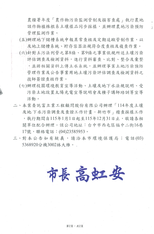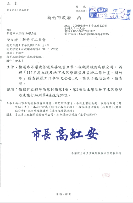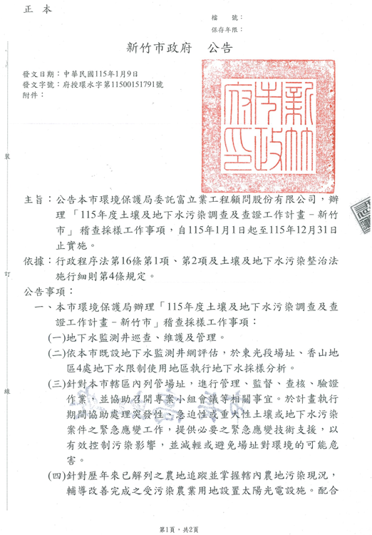檢送本市環境保護局委託富立業工程顧問股份有限公司,辦理「115年度土壤及地下水污染調查及查證工作計畫-新竹市」稽查採樣工作事項之公告1紙,請惠予張貼公告,工作事項公告1份,敬請協助張貼公告,請查照。 2026.01.16