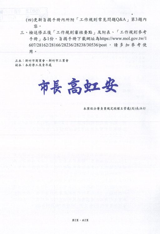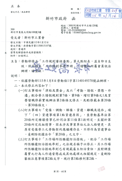 勞動部修正「工作規則審核要點」第九點附表,並自即日生效,併同修正「工作規則參考手冊」,請轉知所屬會員依法辦理,請查照。