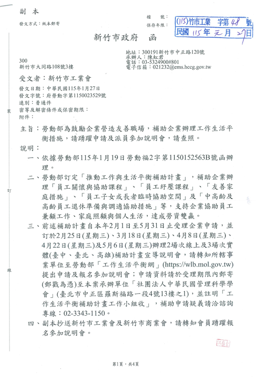 勞動部為鼓勵企業營造友善職場,補助企業辦理工作生活平衡措施,請踴躍申請及派員參加說明會,請查照。