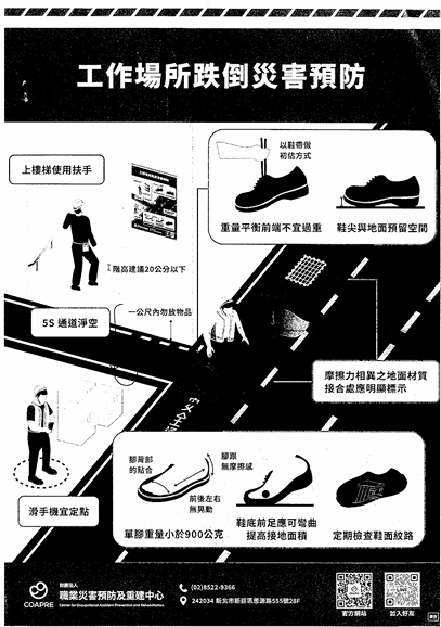 函轉財團法人職業災害預防及重建中心(下稱職災預防及重建中心)製作「工作場所跌倒災害預防」海報,敬請協助宣導,請查照。