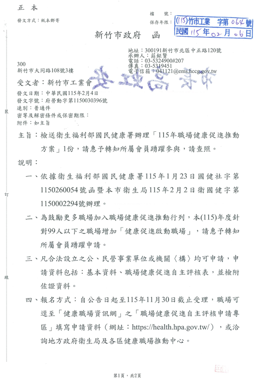 檢送衛生福利部國民健康署辦理「115年職場健康促進推動方案」1份,請惠予轉知所屬會員踴躍參與,請查照。