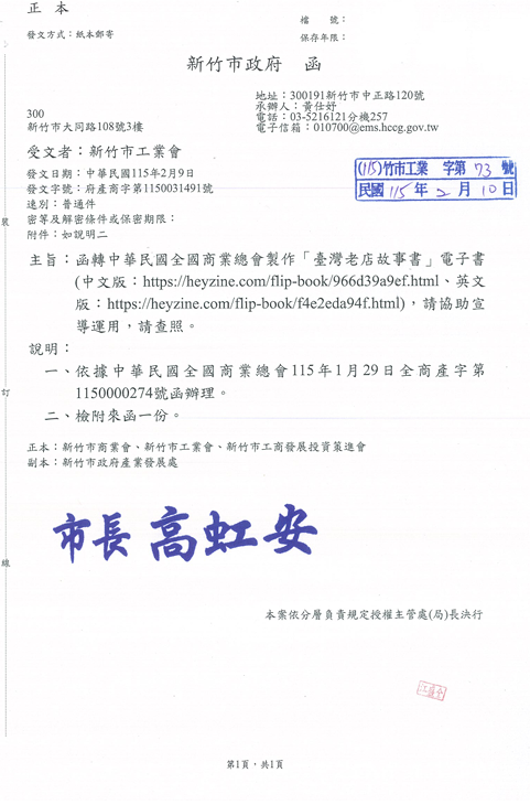 函轉中華民國全國商業總會製作「台灣老店故事書」電子書(中文版:https://heyzine.com/flip-book/966d39a9ef.html、英文版:https://heyzine.com/flip-book/f4e2eda94f.html),請協助宣導運用,請查照。 2026.02.11