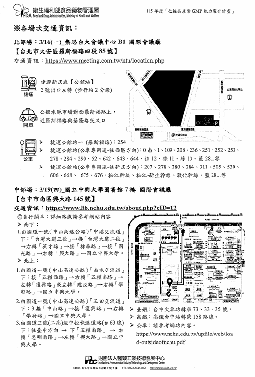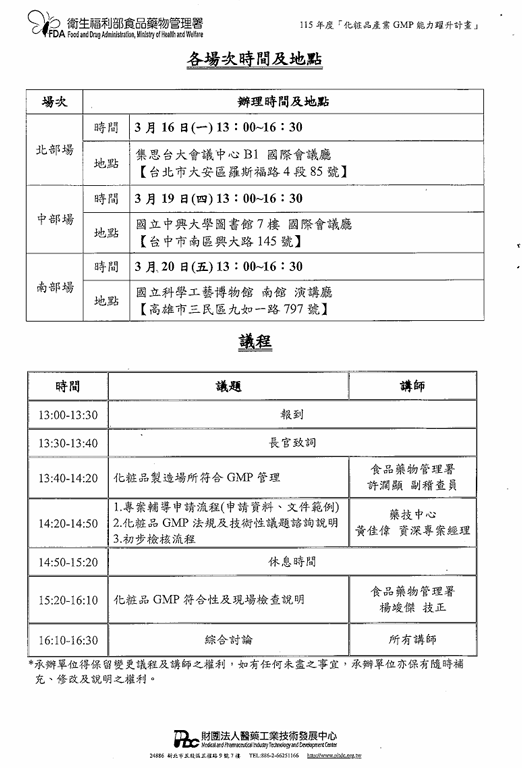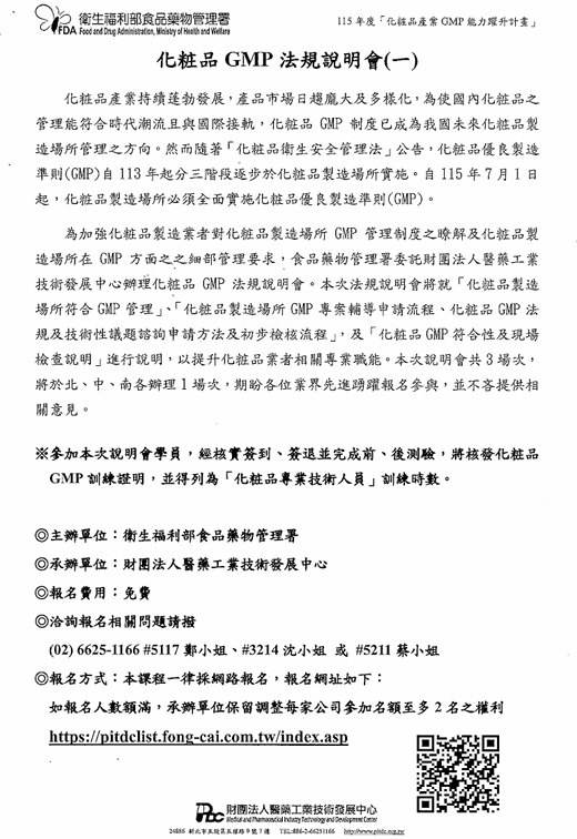 轉知財團法人醫藥工業技術發展中心辦理化粧品GMP法規說明會相關資訊,請轉知所屬會員踴躍報名參加,請查照。