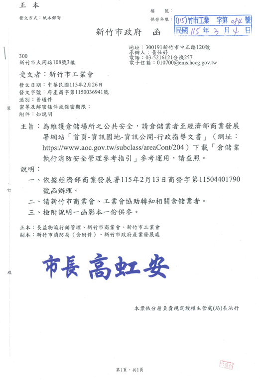 為維護倉儲場所之公共安全,請倉儲業者至經濟部商業發展署網站「首頁-資訊園地-資訊公開-行政指導文書」(網址:http://www.aoc.gov.tw/subclass/areaCont/204)下載「倉儲業執行消防安全管理參考指引」參考運用,請查照。 2026.03.05