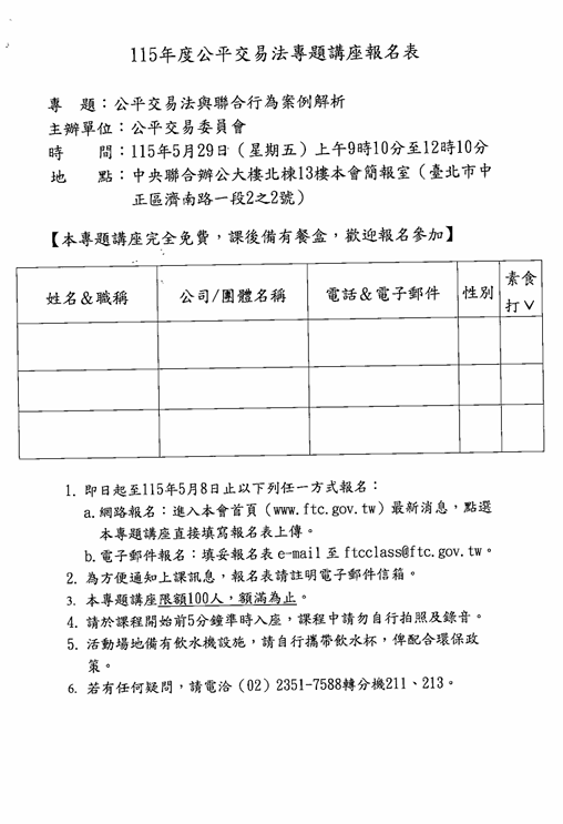 有關公平交易委員會訂於115年5月29日(星期五)假中央聯合辦公大樓13樓簡報室舉辦115年度公平交易法專題講座案,請貴單位轉知所屬人員踴躍參加,請查照。