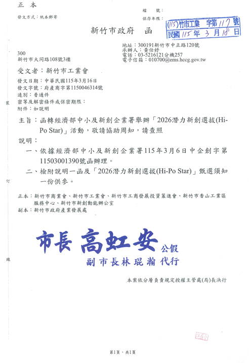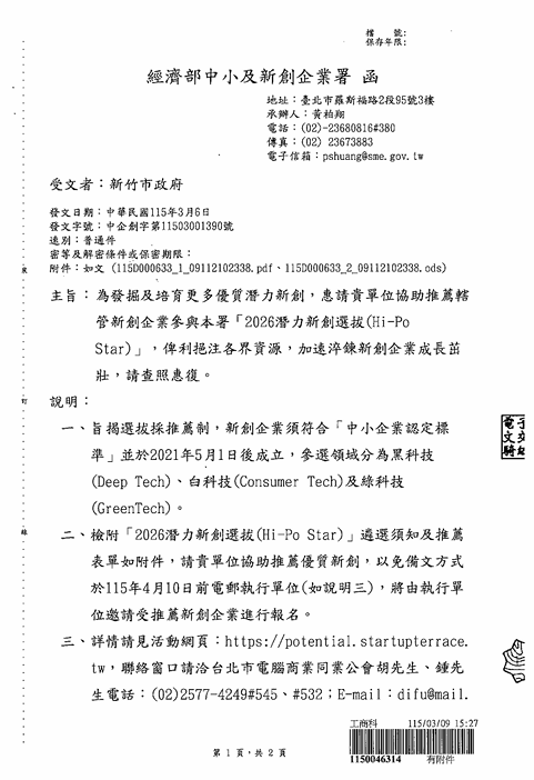 函轉經濟部中小及新創企業署舉辦「2026潛力新創選拔(Hi-Po Star)」活動,敬請協助周知,請查照。