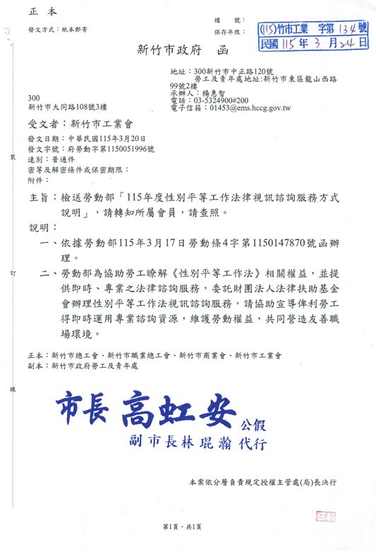 檢送勞動部「115年度性別平等工作法律視訊諮詢服務方式說明」,請轉知所屬會員,請查照。