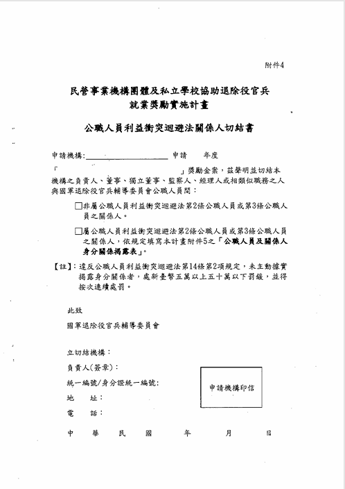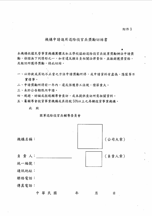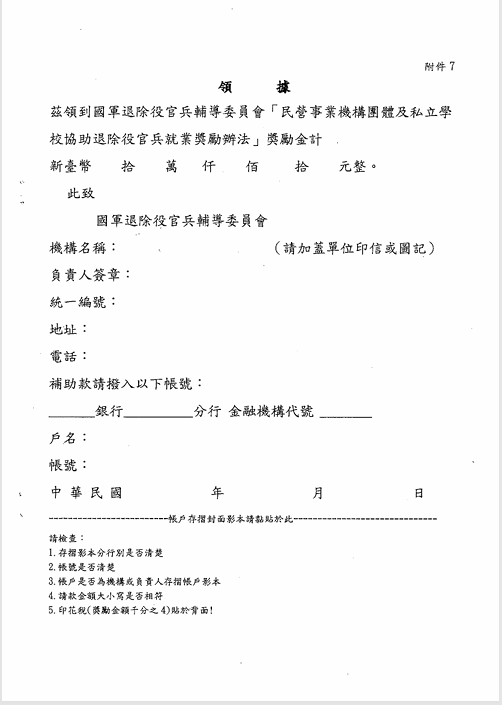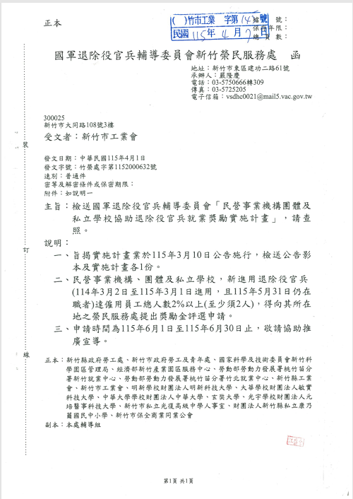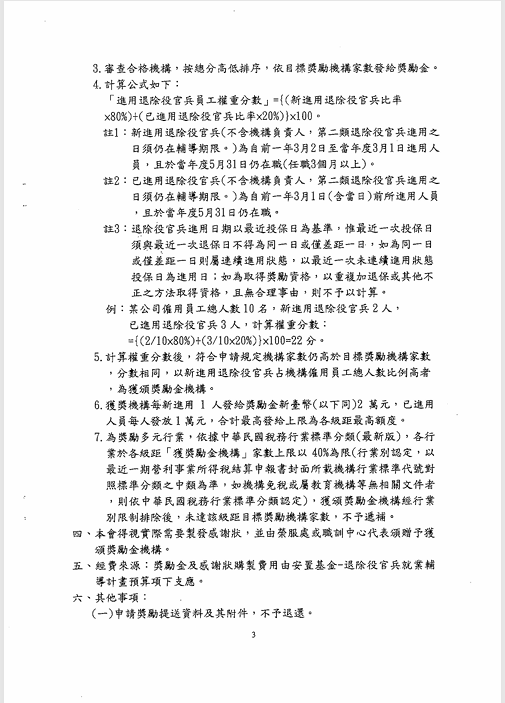 檢送國軍退除役官兵輔導委員會「民營事業機構團體及私立學校協助退除役官兵就業獎勵實施計畫」,請查照。