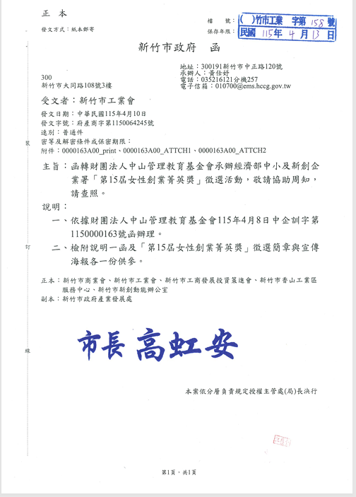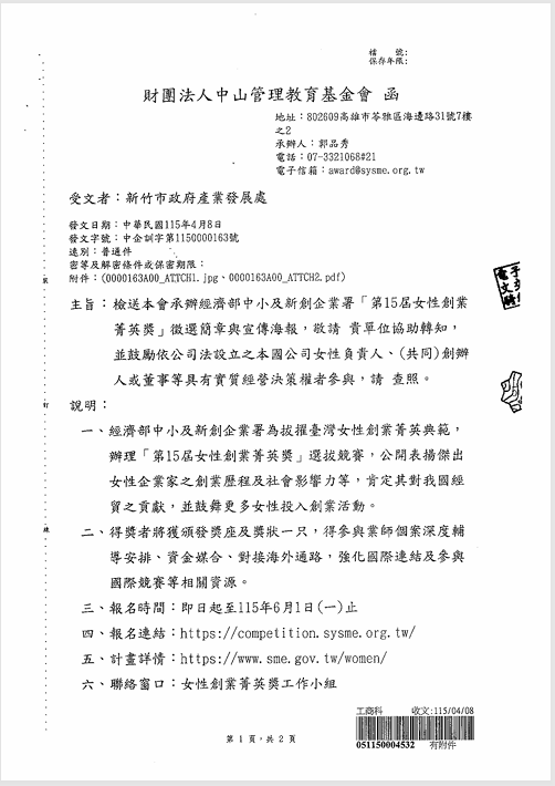 函轉財團法人中山管理教育基金會承辦經濟部中小及新創企業署「第十五屆女性創業基金獎」徵選活動,敬請協助周知,請查照。