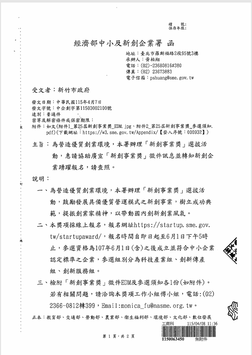 函轉經濟部中小及新創企業署舉辦「新創事業獎」選拔活動,敬請協助周知,請查照。