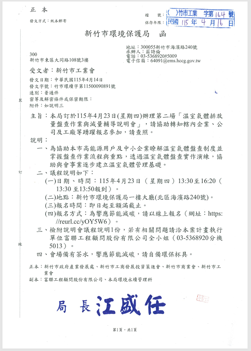 本局訂於115年4月23日(星期四)舉案第二場「溫室氣體排放量盤查作業與減量輔導說明會」,請協助轉知轄內企業、公司及工廠等踴躍報名參加,請查照。