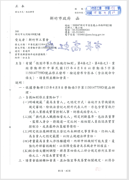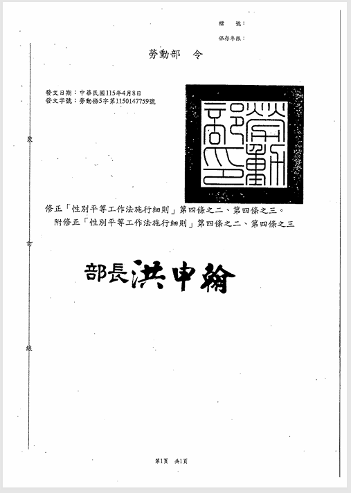 有關「性別平等工作法施行細則」第4條之2、第4條之3,業經勞動部於中華民國115年4月8日以勞動條5字第1150147759D號函修正發布,檢送發布令影本(函法規命令條文),請查照並轉知會員。 2026.04.20