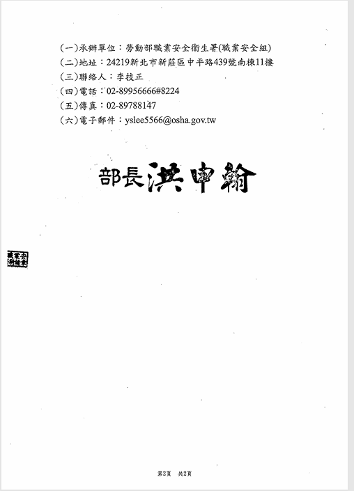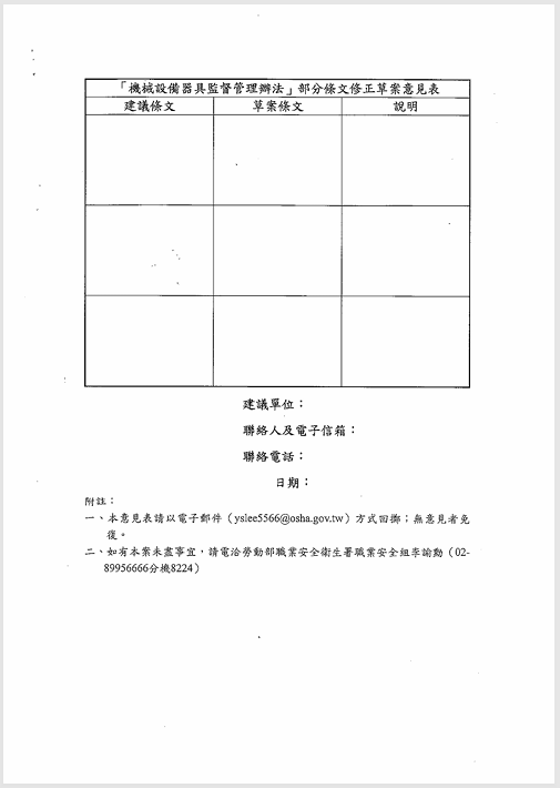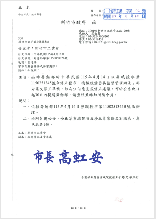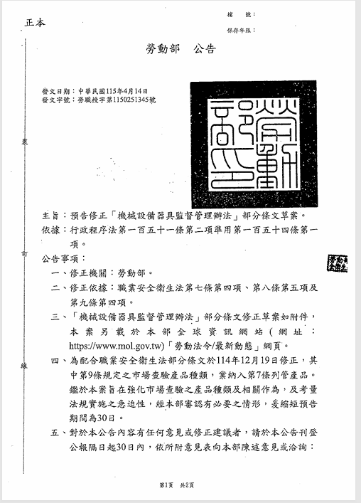 函轉勞動部於中華民國115年4月14日以勞職授字第1150251345號令修正發布「機械設備器具監督管理辦法」部分條文修正草案,如有任何意見或修正建議,可於公告次日起30日內提送勞動部,請查照並轉知所屬會員。 2026.04.20
