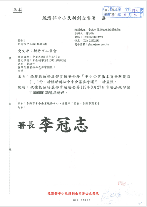 函轉數位發展部資通安全署「115年中小企業基礎資安培訓課程」活動資訊,請協助轉知中小企業踴躍報名參與,請查照。