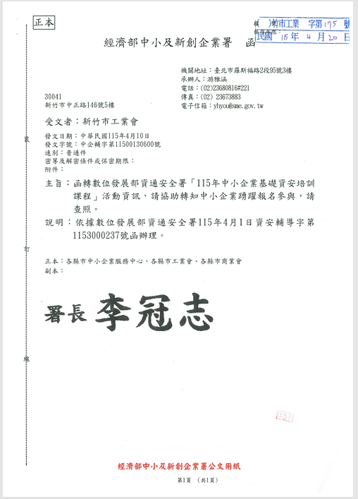 函轉數位發展部資通安全署「115年中小企業基礎資安培訓課程」活動資訊,請協助轉知中小企業踴躍報名參與,請查照。