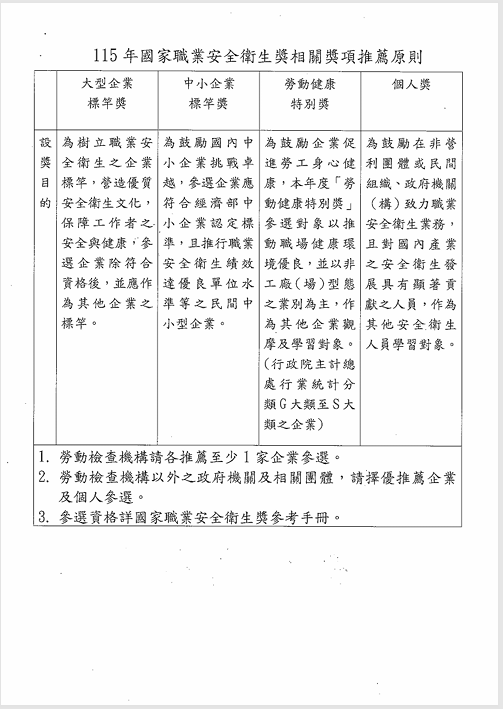 函轉勞動部有關本(115)年「國家職業安全衛生獎」之評選活動,請依說明段辦理,請查照並轉知所屬會員,。