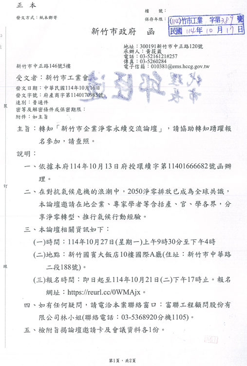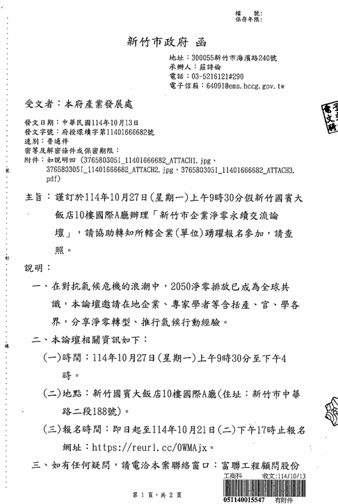 轉知「新竹市企業淨零永續交流論壇」,請協助轉知踴躍報名參加,請查照。