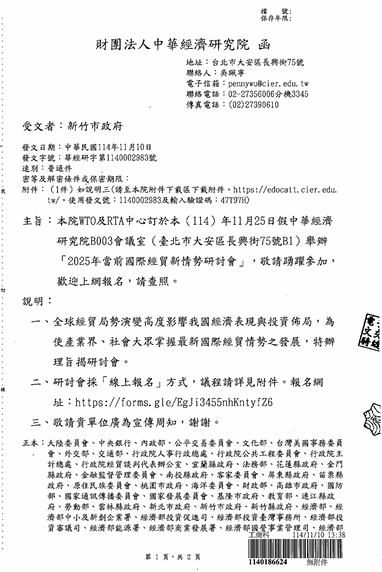 函轉財團法人中華經濟研究院WTO及RTA中心訂於本(114)年11月25日假中華經濟研究院B003會議室(臺北市大安區長興街75號B1)舉辦「2025年當前國際經貿新情勢研討會」,敬請轉知會員踴躍參加,請查照。 2025.11.17