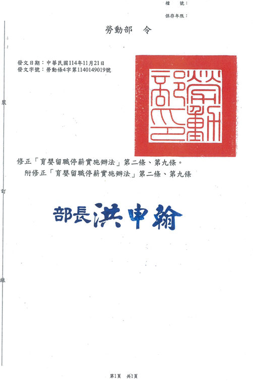 「育嬰留職停薪實施辦法」第2條、第9條,業經勞動部於中華民國114年11月21日以勞動條4字第1140149019號令修正發布,檢送發布令影本(含法規命令條文),請查照並轉知所屬。 2025.12.03