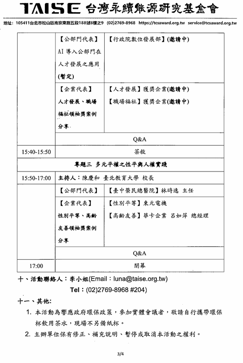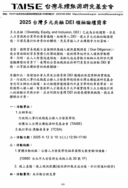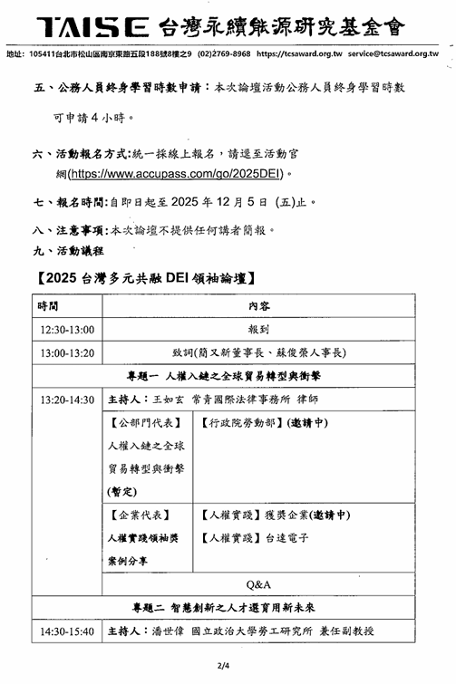 函轉財團法人台灣永續能源研究基金會訂於本(114)年12月10日(三)舉辦「2025第三屆台灣多元共融DEI領袖論壇」,敬請轉知會員踴躍參加,請查照。