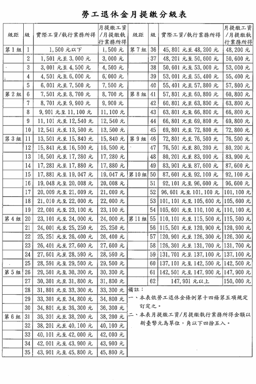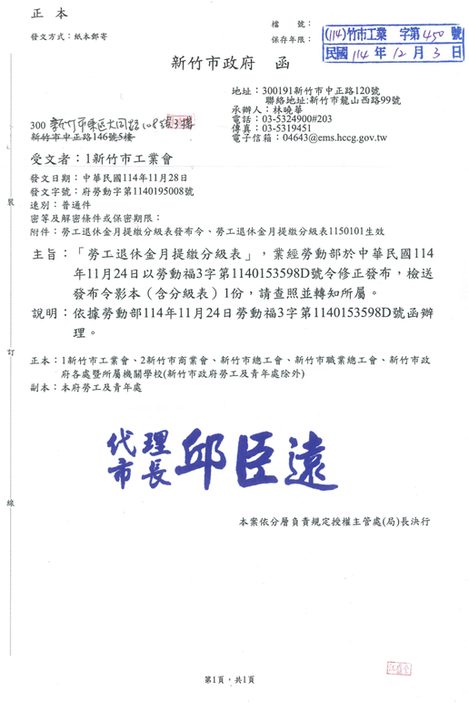 「勞工退休金月提繳分級表」,業經勞動部於中華民國114年11月24日以勞動福3字第1140153598D號令修正發布,檢送發布令影本(含分級表)1份,請查照並轉知所屬。