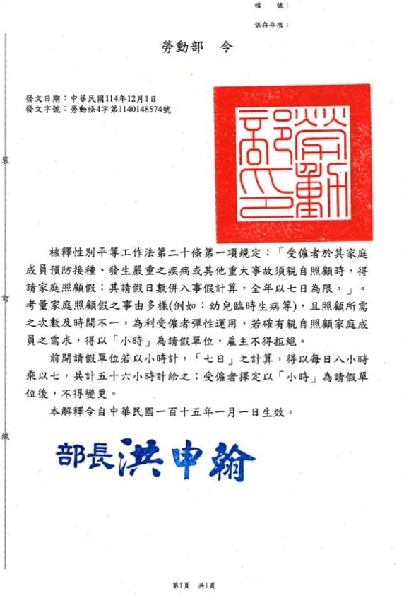 核釋性別平等工作法第二十條第一項規定:「受僱者於其家庭成員預防接種、發生嚴重之疾病或其他重大事故須親自照顧時,得請家庭照顧假;其請假日數併入事假計算,全年以七日為限。」。考量家庭照顧假之事由多樣(例如:幼兒臨時生病等),且照顧所需之次數及時間不一,為利受僱者彈性運用,若確有親自照顧家庭成員之需求,得以「小時」為請假單位,雇主不得拒絕。 前開請假單位若以小時計,「七日」之計算,得以每日八小時乘以七,共計五十六小時計給之;受僱者擇定以「小時」為請假單位後,不得變更。 2025.12.03