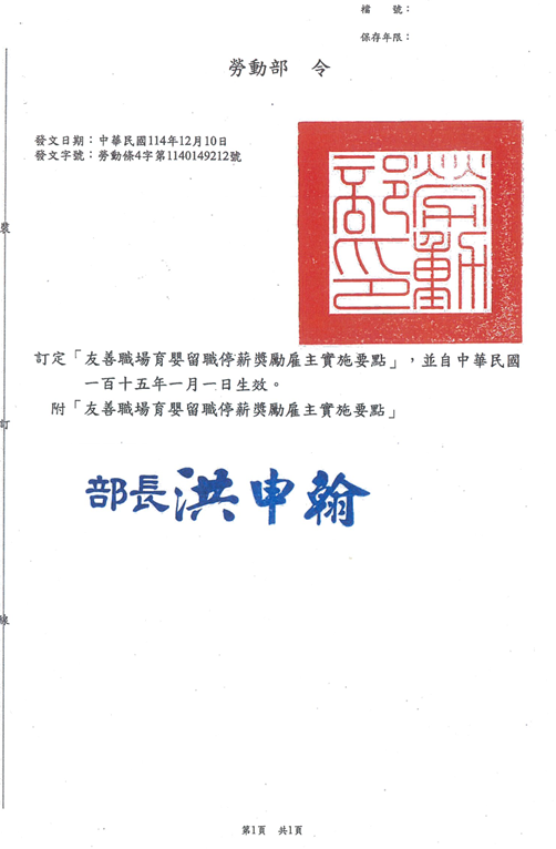 「友善職場育嬰留職停薪獎勵雇主實施要點」,業經勞動部於中華民國114年12月10日以勞動條4字第1140149212號令訂定發布,自115年1月1日生效,檢送「友善職場育嬰留職停薪獎勵雇主實施要點」1份,請查照並轉知所屬會員知悉。 2025.12.22