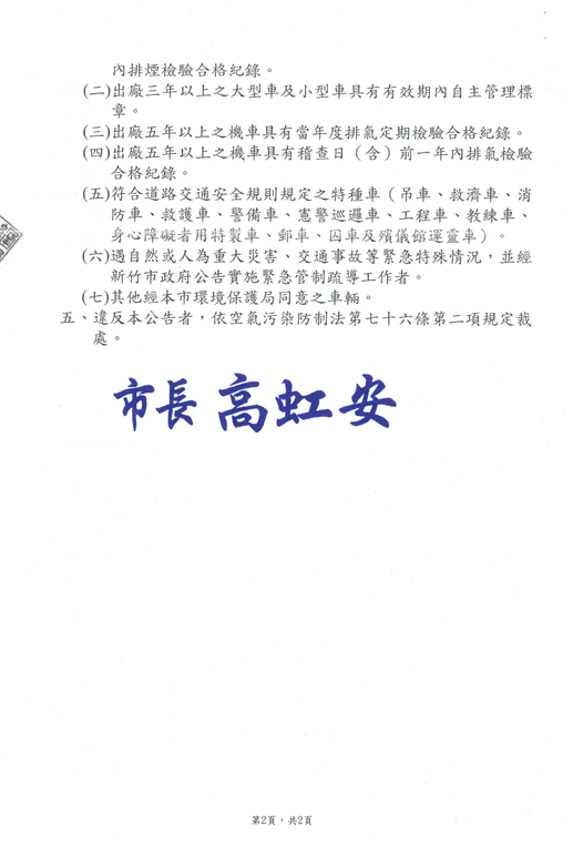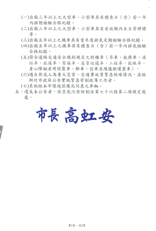 檢送「新竹市學府路及博愛街(文教區)空氣品質維護區實施移動污染源管制措施」、「新竹市新竹科學園區空氣品質維護區實施移動污染源管制措施」及「新竹市虎林國民中學、國民小學空氣品質維護區實施移動污染源管制措施」公告各1份,請惠予張貼,請查照。 2026.01.02