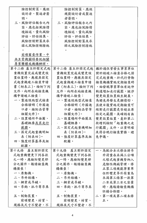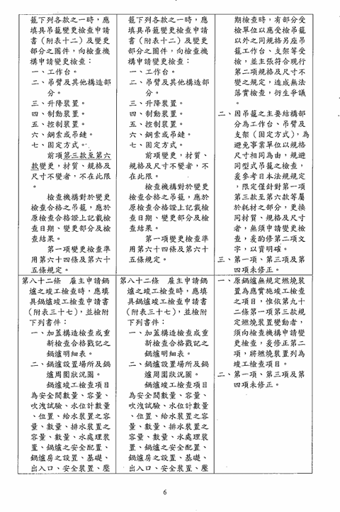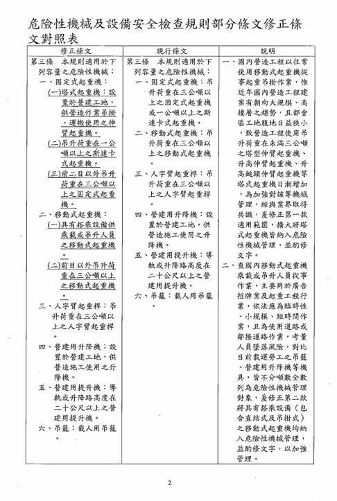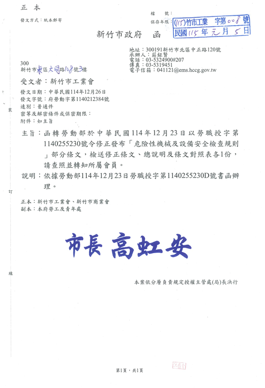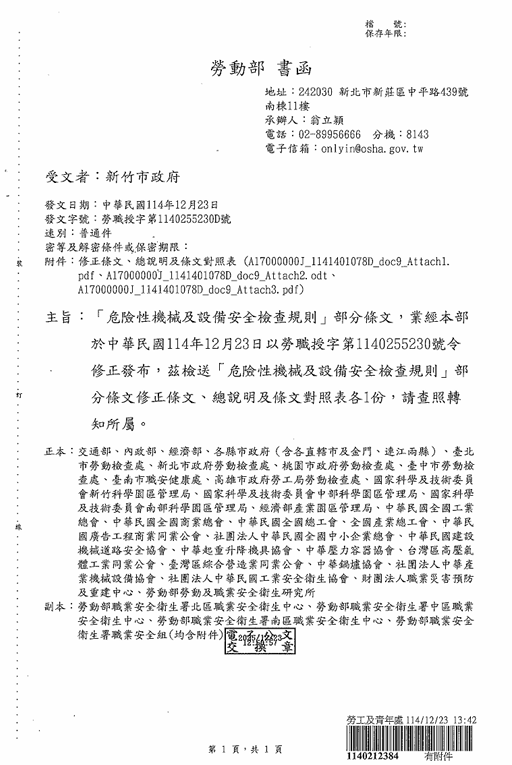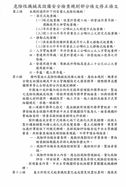 函轉勞動部於中華民國114年12月23日以勞職授字第1140255230號令修正發布「危險性機械及設備安全檢查規則」部分條文,檢送修正條文、總說明及條文對照表各1份,請查照並轉知所屬會員。 2026.01.05 危險性機械及設備安全檢查規則修正草案