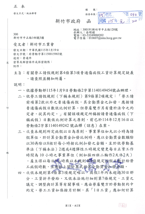 有關勞工請假規則第4條第3巷普通傷病假工資計算規定疑義,請查照並轉知所屬。