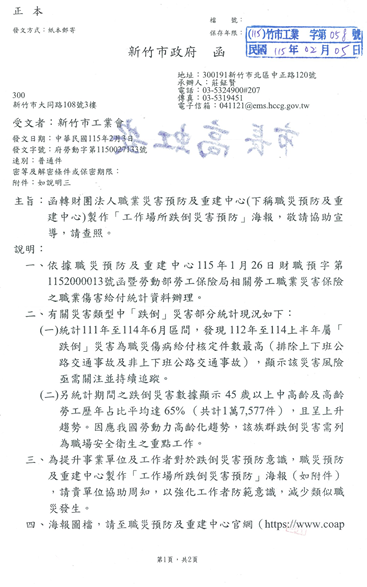 函轉財團法人職業災害預防及重建中心(下稱職災預防及重建中心)製作「工作場所跌倒災害預防」海報,敬請協助宣導,請查照。