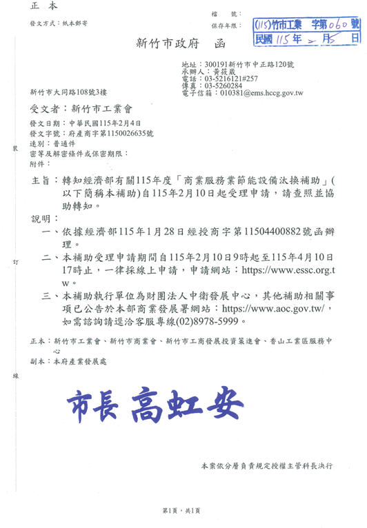 轉知經濟部有關115年度「商業服務業節能設備汰換補助」(以下簡稱本補助)自115年2月10日起受理申請,請查照並協助轉知。