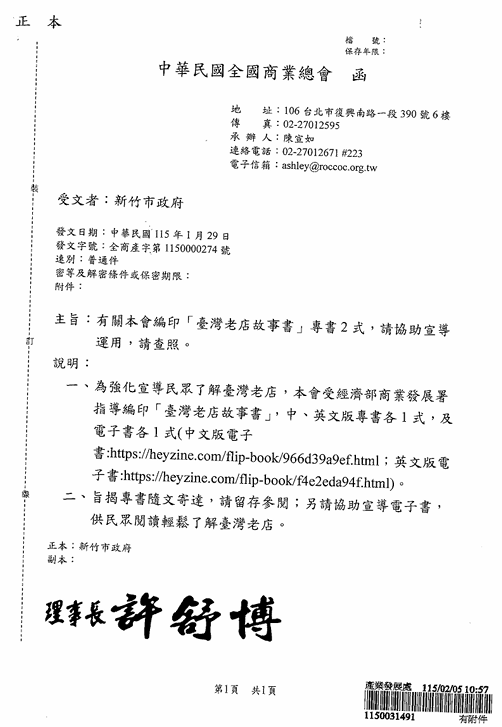 函轉中華民國全國商業總會製作「台灣老店故事書」電子書(中文版:https://heyzine.com/flip-book/966d39a9ef.html、英文版:https://heyzine.com/flip-book/f4e2eda94f.html),請協助宣導運用,請查照。 2026.02.11