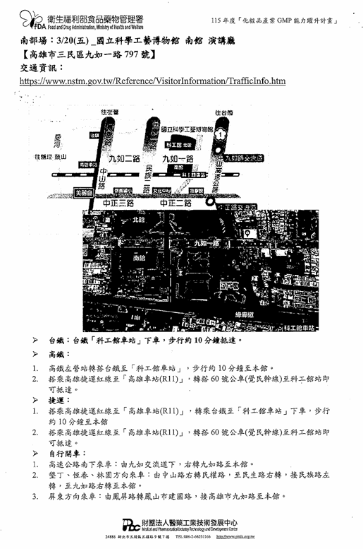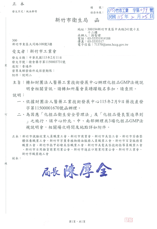 轉知財團法人醫藥工業技術發展中心辦理化粧品GMP法規說明會相關資訊,請轉知所屬會員踴躍報名參加,請查照。