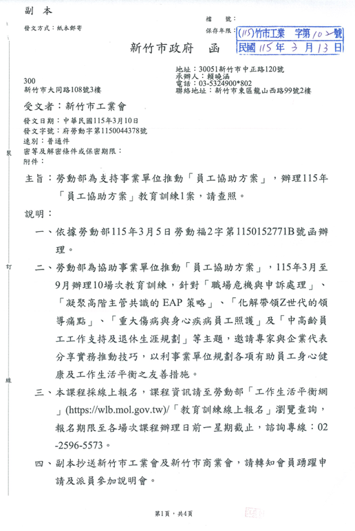 勞動部位支持事業單位推動「員工協助方案」,辦理115年「員工協助方案」教育訓練1案,請查照。