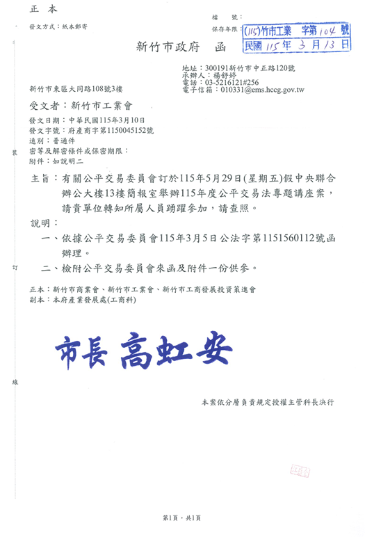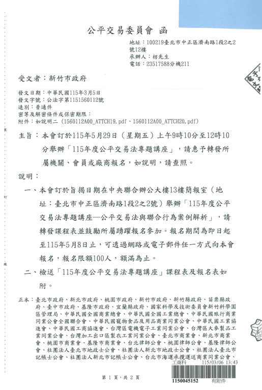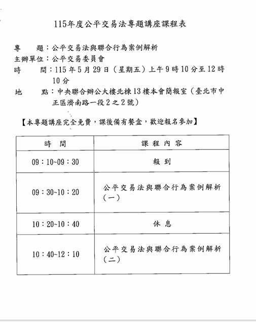 有關公平交易委員會訂於115年5月29日(星期五)假中央聯合辦公大樓13樓簡報室舉辦115年度公平交易法專題講座案,請貴單位轉知所屬人員踴躍參加,請查照。