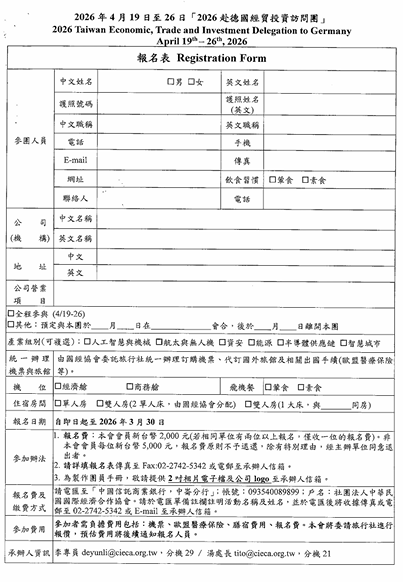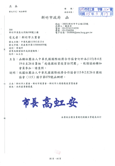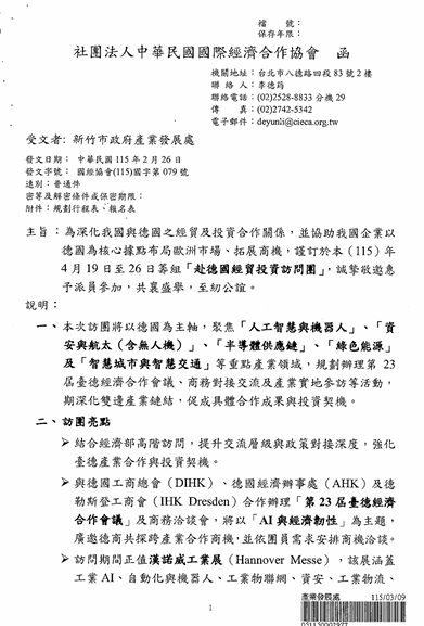 函轉社團法人中華民國國際經濟合作協會訂於本(115)年4月19日至26日籌組「赴德國經貿投資訪問團」,敬請協助轉知會員參加,請查照。