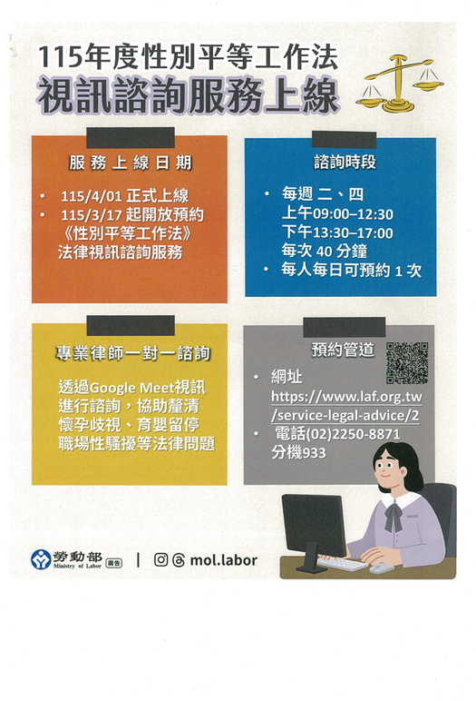 檢送勞動部「115年度性別平等工作法律視訊諮詢服務方式說明」,請轉知所屬會員,請查照。
