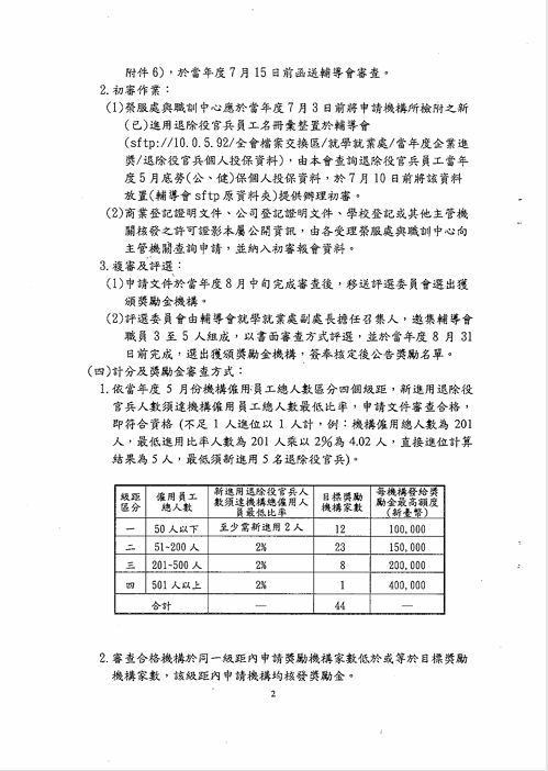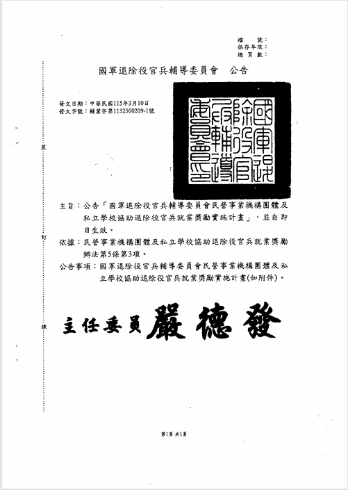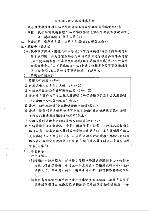 檢送國軍退除役官兵輔導委員會「民營事業機構團體及私立學校協助退除役官兵就業獎勵實施計畫」,請查照。