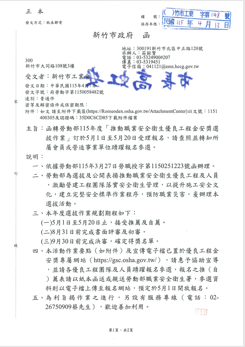 函轉勞動部115年度「推動職業安全衛生優良工程金安獎選拔作業」訂於5月1日至5月20日受理報名,請查照並轉知所屬會員或營照事業單位踴躍報名參選。