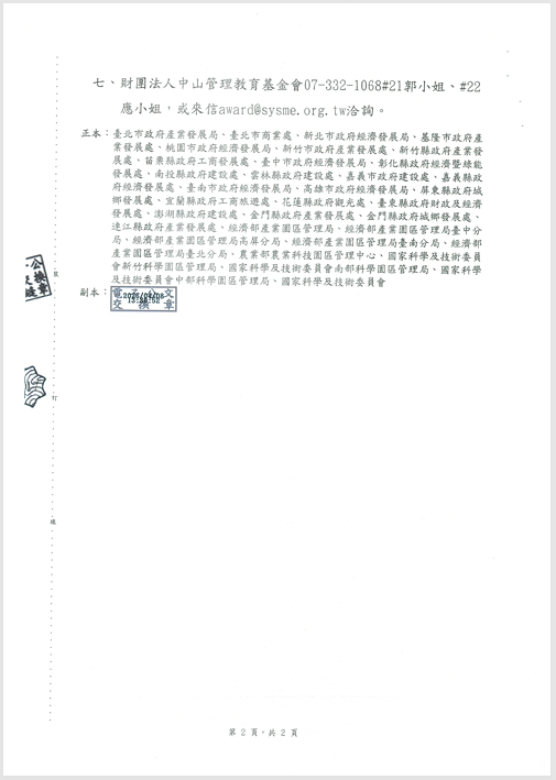 函轉財團法人中山管理教育基金會承辦經濟部中小及新創企業署「第十五屆女性創業基金獎」徵選活動,敬請協助周知,請查照。